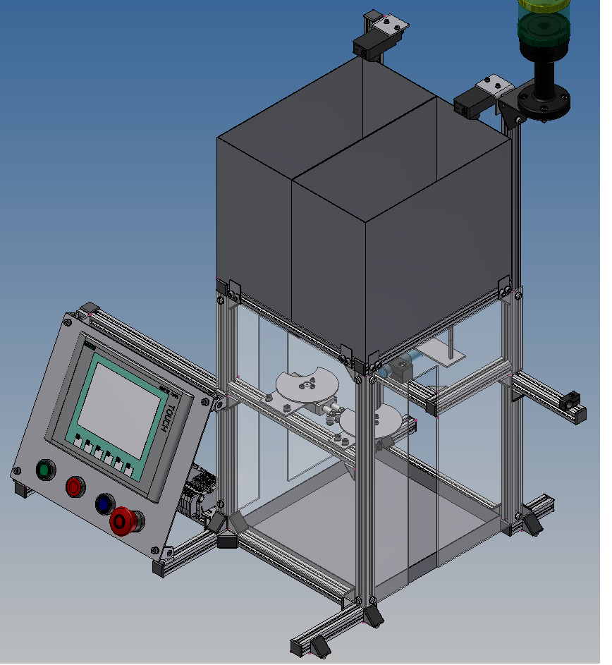 Fonctionnement1. Réception & Séparation des bouteillesLa bouteille arrive par la gauche sur le premier poste. Elle est détectée par le premier capteur capacitif (en bleu). Le dosage du premier liquide se fait. Puis, le disque tourne à la phase d'éjection, après la fin du dosage pour le premier liquide. Lorsque le disque tourne, il ne laisse que la bouteille qui est dans son encoche passer. De cette manière, la station sépare de façon simple les bouteilles.